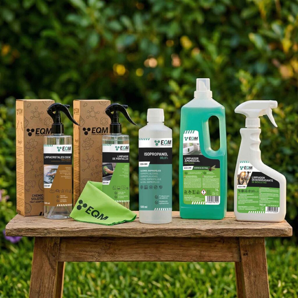 En nuestra gama de productos químicos y de limpieza disponemos de desengrasantes profesionales (desengrasante extra fuerte para talleres, desengrasante concentrado para cocinas industriales, desengrasante neutro multiusos), friegasuelos de alta concentración como nuestro friegasuelos con citronela o friegasuelos para robot de limpieza, alcoholes de alta pureza como el alcohol isopropílico 99,9% para electrónica y laboratorio, limpiadores especializados para automoción (champú para carrocerías, lavaparabrisas, limpiallantas neutro, eliminador de insectos), productos para el mantenimiento de piscinas (reductor de pH natural, limpiador desincrustante para gresite, floculante líquido), químicos industriales (ácido clorhídrico, sosa cáustica líquida, eliminador de óxido, D-Limoneno), anticongelantes y glicoles puros (monoetilenglicol, propilenglicol, anticongelante para placas solares), entre muchos más.